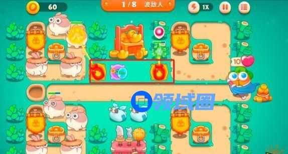 3.第三步在下排设置新炮塔,兔子快清完时让炮塔清理其他道具。