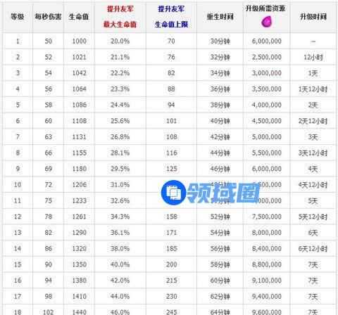 每秒伤害、生命值、提升友军最大生命值、提升友军生命值上限等参数,与进攻状态相同!