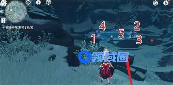 2、来到雪葬之都·近郊,按照图中标注的顺序,使用冰角色将元素方碑点亮。然后会出现洞口。进入使用3个深赤之石解锁碎片。
