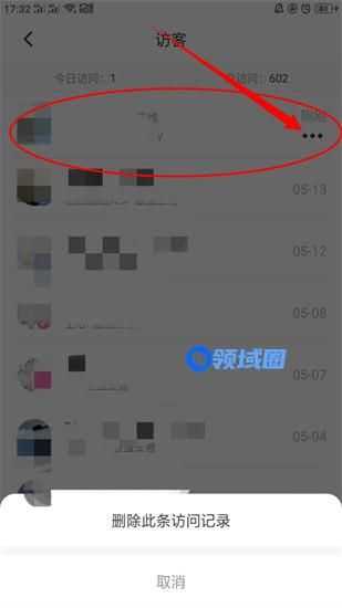 4、在访客里可以看到别人的访客记录,但是只能删除自己的,点击自己的访问记录后方的省略号,在弹出的删除按钮,点击删除即可。