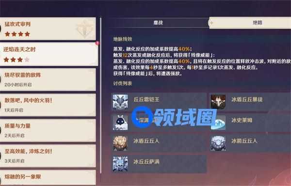 讨伐列表:比「鏖战」多了「丘丘霜铠王」,加大了对输出的压力,走位不好会被秒掉,优先破盾效率,可以风系和火系搭配