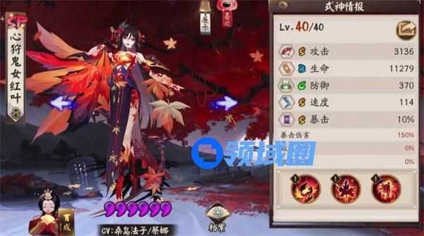 2、在SP阶式神心狩鬼女红叶的面板属性中,攻击、速度和暴击属性都是S,面板是非常不错的。