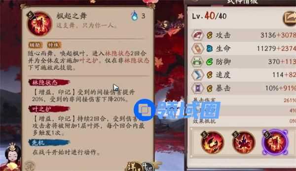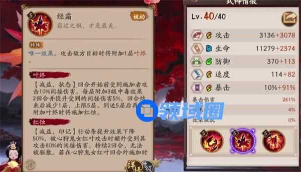 3、二技能被动,红叶打人会附加独特debuff“叶烬”,此debuff很全能,即能叠毒、也能降攻减防,还能降低攻击红叶者的暴击。