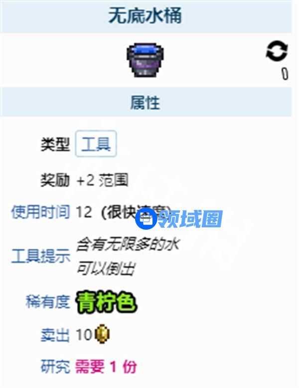 游戏中无底水桶是一种功能和标准水桶类似的物品,唯一的区别是它无需重新装水,可以无限次使用,并且其范围略大,放水的速度还比标准的水桶略快。