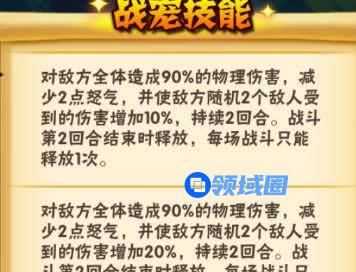 技:对敌方全体造成90%的物理伤害,减少2点怒气,并使敌方随机2个敌人受到伤害增加10%,持续2回合。战斗第2回合结束时释放,每场战斗只能释放一次。