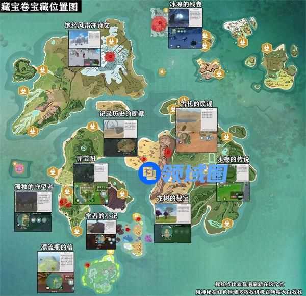 在创造与魔法的世界中你可与朋友一起在其中做着喜欢的事情,无忧无虑,可建造各种建筑物或者去猎杀不同的怪物成为一个探险者,想在这个自由的世界中干啥都行,只要你有创意随时都可打造出一个奇幻的国度,丰富的玩法供你尝试。游戏中通过探索或者参加最新的活动玩法可获取到大量的藏宝图,获取这些藏宝图就能找到隐藏中地图中某处的神秘宝藏,我们不知道宝藏中会得到什么东西,充满了神秘感,据了解能从中获取冰凉的残卷、饱经风霜冻诗文、记录历史的断章、古代的民谣等稀有材料,接下来为大家介绍一下创造与魔法藏宝图位置一览。