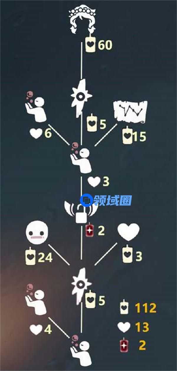 1、先祖的兑换道具有花环发型、面具以及1-4级的吹泡泡动作,面具以及乐谱等道具,兑换所有奖励需要112个蜡烛、13个爱心和2个升华蜡烛。
