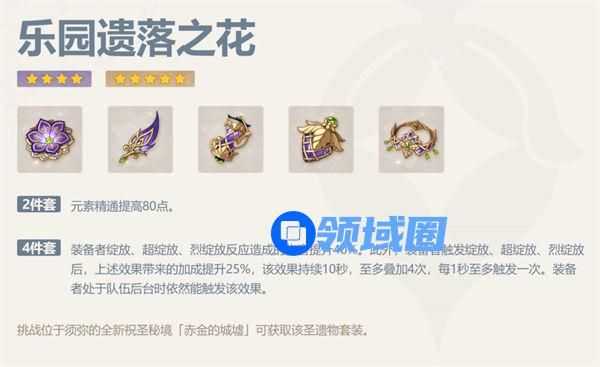 最近大部分玩家都在沉迷原神中的七圣召唤玩法,该玩法非常的友好,上手门槛超低的,哪怕不懂规则也能沉迷其中,非常的打发时间。乐园遗落之花是原神现版本更新时一同推出的两套新圣遗物之一,许多玩家还在纠结乐园遗落之花值不值得刷的问题而苦恼,对该圣遗物套装带来的加成效果不是很了解,该圣遗物套装只适合指定的阵容搭配,泛用性不强,根据套装带来的效果可知,最适合容易触发绽放、超、烈绽放反应的角色阵容使用,其中就必须要有草系,主玩以草神为主的阵容玩法可刷一套,接下来为大家介绍一下原神乐园遗落之花圣遗物属性分析。