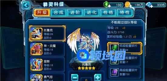 选择精灵后系统(已经上阵的精灵可直接点击“战队”进入升级)会自动添加所需的能量碎片(低级能量碎片、中级能量碎片、高级能量碎片)点击升级可让精灵等级获得提升。