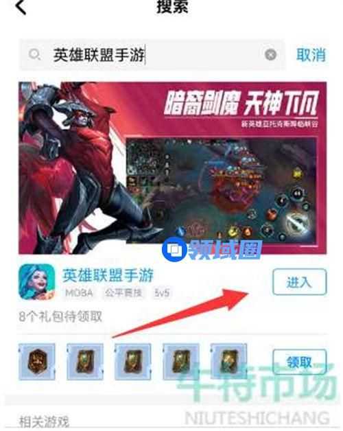 2、在游戏中心页面上方的搜索框内输入:英雄联盟手游的关键字点击进入;