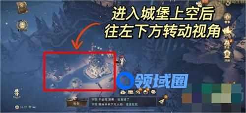 1、首先我们需要来城堡上空的位置,顺着如下图所示向左下角转动视角,飞到黑湖的下面;