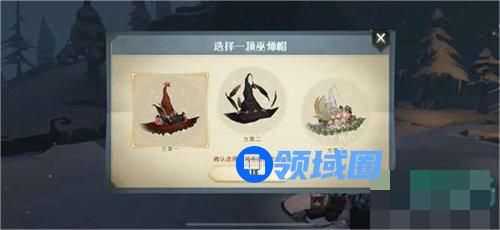 3、对话过程中会出现三个设计方案,在这里我们可以选择一顶巫师帽领取;