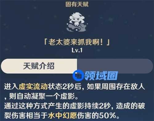 虽然莫娜比起别人来说多了一个天赋,但这并不妨碍其身上多了这样一个抽象的天赋。需要周围有敌人且进入虚实流动状态2s后才能触发,并且虚影的实用价值非常低。