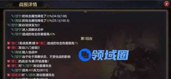 而除了战必反计之外,在前三回合发动的任意其他控制战法对甘宁来说都不是大问题,途中的甘宁就轻巧的避开了曹仁的八门金锁。在对面携带战必反计以及其他多种控制战法时,甘宁等于以自己的自带战法同时废掉对面多个战法的作用还拥有高额的攻击加成,非常给力。