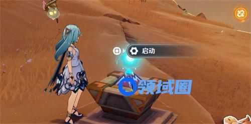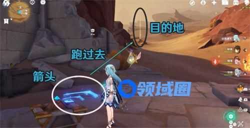 1、下方是风之厄灵的起点 蓝色的光球是风之厄灵,点击启动,浮现箭头,远方出现目的地光柱提示,携带它前进;
