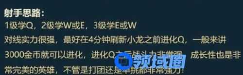 对线实力很强,最好在4分钟刷新小龙之前进化Q,一般来说,3000金币可以进化,进化Q之后战斗力很强,成长性也是很完美的英雄,无论是打团还是单挑都很强!