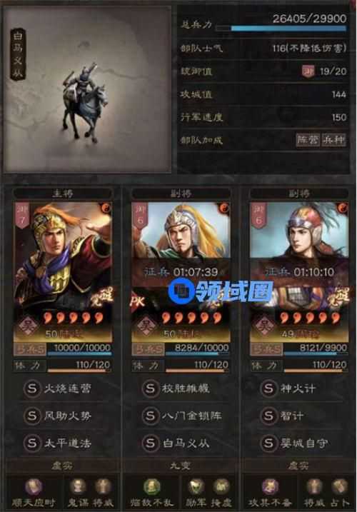 同时,有的朋友可能会问了,这里的白马义从跟八门金锁不冲突吗?其实也有这俩搭配在一起的玩法。对主将来说先攻,是有重叠、损失的,这个角度上是冲突的。但八门金锁其本质上是一个减伤战法,又是一个五个阵法其中之一,所以如果只想用来减伤这么带也不会有那么大的损失,影响较小。而八门的减伤,其实是巨量的,尤其在面对无增伤的队伍时,优势会是非常明显的。