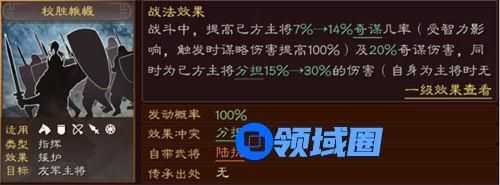 陆抗的战法,看起来还是很不错的。就我个人而言,是非常喜欢奇谋这种词缀的,尤其他还可以跟太平道法叠加在一起,比如我们这里要讲的陆逊主将携带太平道法,配合陆抗,直接就给陆逊的奇谋几率叠到了近50%。陆抗+主将太平的组合,就是一个陆抗的经典使用方式。