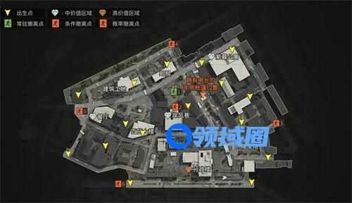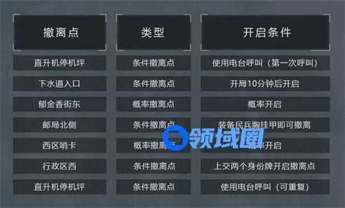 除了这两处撤离点外,地图中还有两个概率撤离点和两个条件撤离点。位于地图西侧餐厅附近的西区哨卡撤离点(5号撤离点)和位于郁金香街东的撤离点(3号撤离点),有50%的概率开启。地图北部的邮局北侧撤离点(4号撤离点)需要穿戴“民兵胸挂甲”并坚守20秒才能撤离,“民兵胸挂甲”可以通过淘汰附近的游荡者获取。地图南部的行政区西撤离点(6号撤离点)需要上交两枚身份牌,并坚守20秒即可撤离。如果在行政楼区域激战之后,不想冒风险从下水道或者直升机撤离,那么交身份牌撤离无疑是最佳选择。