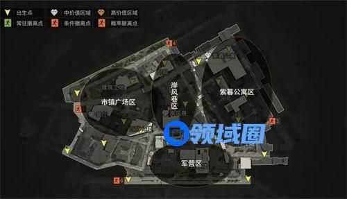 和农场、山谷以及北山类似,军港分为普通模式和封锁区模式,今天我们就以普通模式为主,进行解析,封锁区的内容以后再跟大家聊。首先我来带大家简单熟悉下军港的地形。军港是一个标准的巷战类地图,房屋与街道相互交错,我们可以用建筑群将军港大致分为四个区域:西北的市镇广场区,中间的岸风巷区,东部靠北的紫暮公寓区和南部独立成片的军营区。