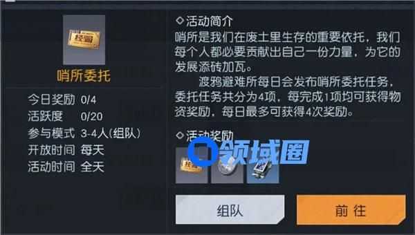 大家可以在日程中找到哨所委托,如果你点击前往,系统将为你自动寻路到渡鸦避难说的戈登队长位置。如果你想带队参与,那么可以选择在创建队伍后先行移动至戈登队长处招募队友,在队伍满员后即可利用组队系统召唤队友到当前位置来。如果你想以队员的身份参加,只需要在队伍系统中进行匹配,直到队长召唤你为止。