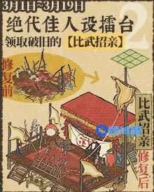 1、3月1日—3月19日期间,在公告页面可以领取破旧的【比武招亲】擂台建筑,并摆放在小镇中