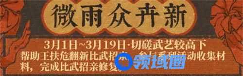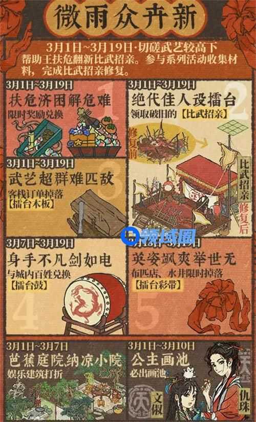 微雨众卉新是江南百景图即将在1天后开启的全新活动,微雨众卉新分为多个小活动,从3月1日陆续开启,最晚的那一个在3月13日,差不多都在3月19日结束,活动玩法丰富,每个玩家都可参与其中。领取自己想要的奖励,奖品丰富等着大家来积极获取。在活动中你能见识到精彩的武艺比拼,还有古代有趣的比武招亲,不知最后出嫁的小姐花落谁家,真叫人期待。这次活动需要收集擂台木板、擂台鼓、擂台彩带等材料,搭建现场建筑的必需品,没建成比武招亲都看不了,接下来为大家介绍一下江南百景图微雨众卉新活动奖励一览。
