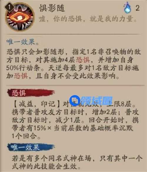 恐惧只会如影随形,指定1名非召唤物的敌方目标,对其施加4层恐惧,并增加自身50%行动条。天逆每最多对1名敌方目标施加恐惧,且自身不会受此效果影响。