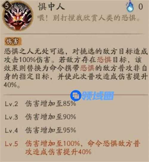 恐惧之人无处可逃,对挑选的敌方目标造成攻击100%伤害。若敌方存在恐惧目标,该效果则替换为命令携带恐惧的敌方普攻非自身的指定目标,并使此次普攻造成伤害提升40%。