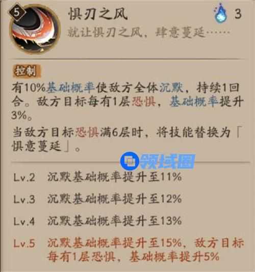 有10%基础概率使敌方全体沉默,持续1回合。敌方目标每有1层恐惧,基础概率提升3%。