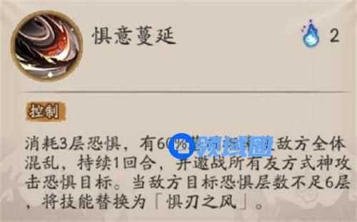 消耗3层恐惧,有60%基础概率使敌方全体混乱,持续1回合,并邀战所有友方式神攻击恐惧目标。当敌方目标恐惧层数不足6层,将技能替换为「惧刃之风」。