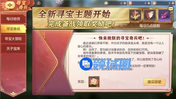 接见信使后,开启寻宝备战任务。每日完成讨伐魔将、家园互动、群雄逐鹿等玩法条件即可获得西凉藏宝图碎片及初级神锻石、中级神锻石、紫神兵碎片任选、橙神兵碎片任选等奖励。
