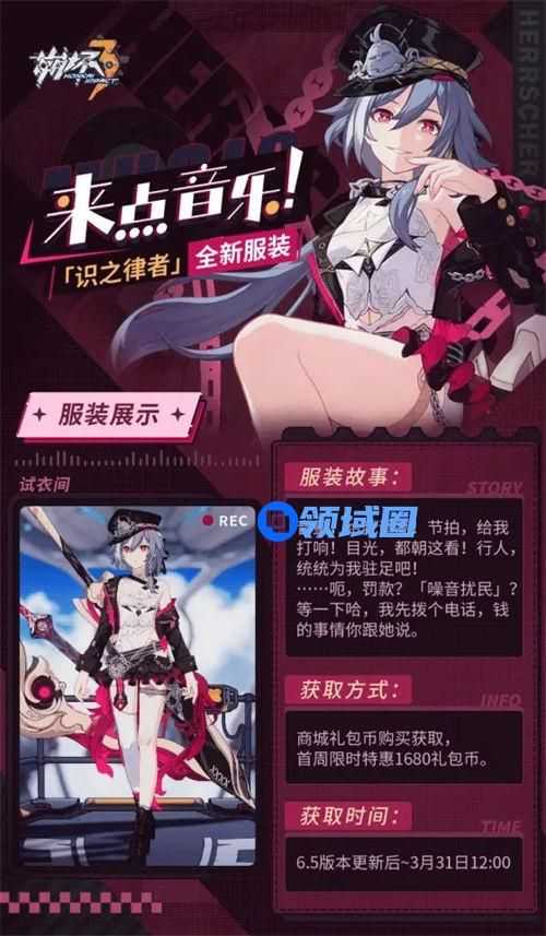 来点音乐是游戏中识之律者的新皮肤,设计题材以为音乐为主,你可在服装上看到许多和音乐有关的元素,技能特效也是围绕了该元素塑造,释放的瞬间有酷炫的画面演出和音效,专为喜欢音游的玩家量身定做。相信细心的玩家已经发现了这次新版本更新的内容几乎离不开音乐,新女武神也一样,大招是全新的敲打音符方式,可在战斗中尽情享受敲击的乐趣,这款皮肤和上一款沙滩主题皮肤相比逊色不少,不够清凉,外观到比较新颖,喜欢的玩家可以入手,售价1680礼包币,接下来为大家介绍一下崩坏3识之律者来点音乐皮肤外观一览。
