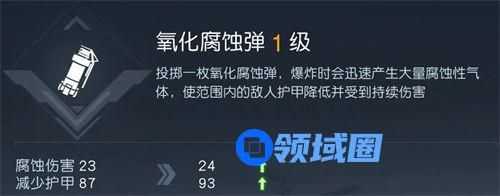 技能效果:投掷后迅速爆炸,产生大量淡黄色气体烟雾,对范围内的敌人造成少量腐蚀伤害,但是减少敌人的大量护甲。