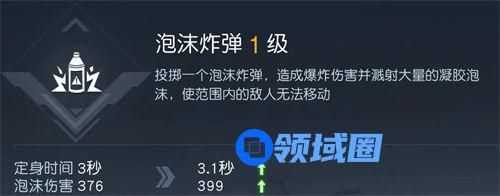 技能效果:投掷后稍缓爆炸,对范围内的敌人溅射大量凝胶泡沫,造成中等伤害,并使范围内的敌人定身一段时间。