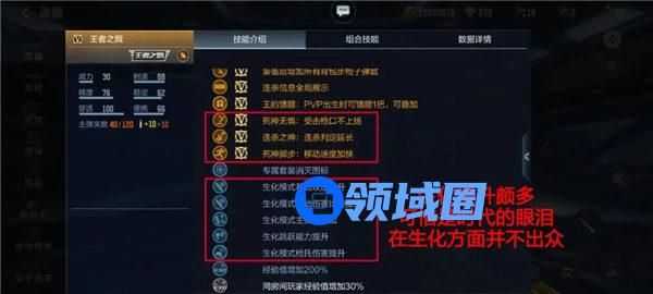 首先我们来看技能面板,比较有用的技能有连杀判定延长,枪口受击不上扬和移速加快,与此同时,王者之戮作为多模式神器也继承了死神系列的生化加成,不过王者之戮比起M4死神的生化加成更高,对于生化加成我也是进行了测试,经测试王戮伤害大概比起死神提高10%左右,就以这些提升而言,足以能让王戮在生化中独当一面,即使就目前环境来说,也只是仅次于王狱和宙斯的存在。