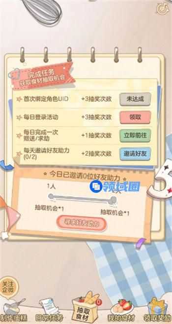 每天登录完成对应的游戏任务,可以获得抽取蛋糕材料的机会,还可以邀请好友助力。