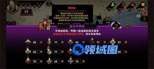 首排上座:不满值-15,若不满值<40,其他同列藩王不满值-10