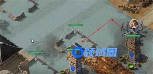 先手形武将(骑兵),可以放置在城门后3格,可以利用其6格移动力大范围出击;