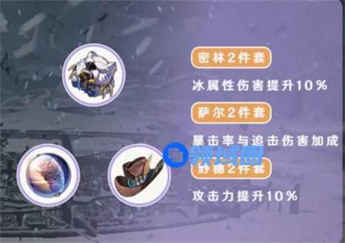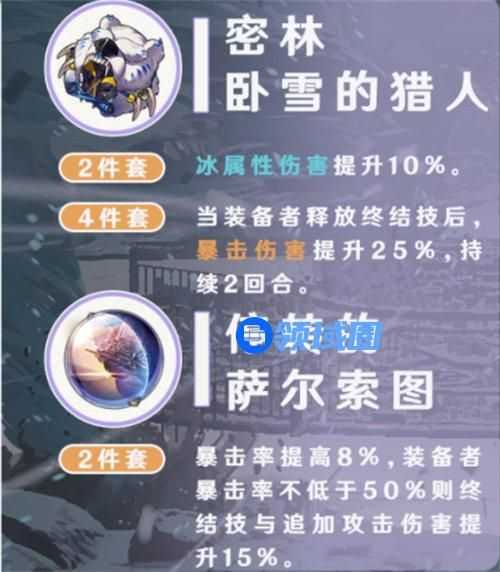 (2)密林卧雪的猎人套:2件提升冰属性10%伤害;4件释放终结者技后,暴击伤害提升25%。