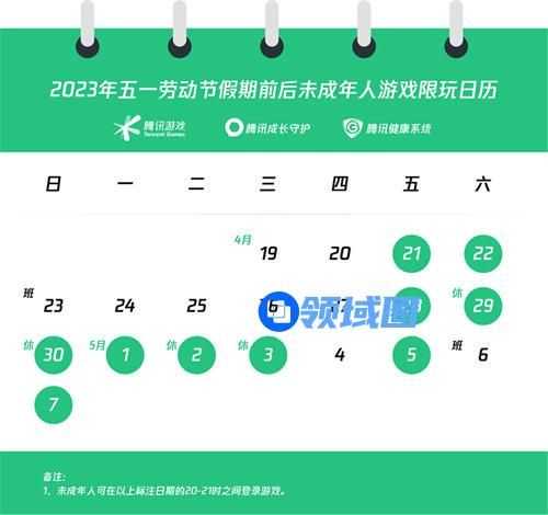结合《关于进一步严格管理 切实防止未成年人沉迷网络游戏的通知》与实际放假调休安排,2023年五一劳动节假期前后,腾讯游戏旗下在中国大陆地区运营的网络游戏面向未成年人的游戏限玩执行如下:
