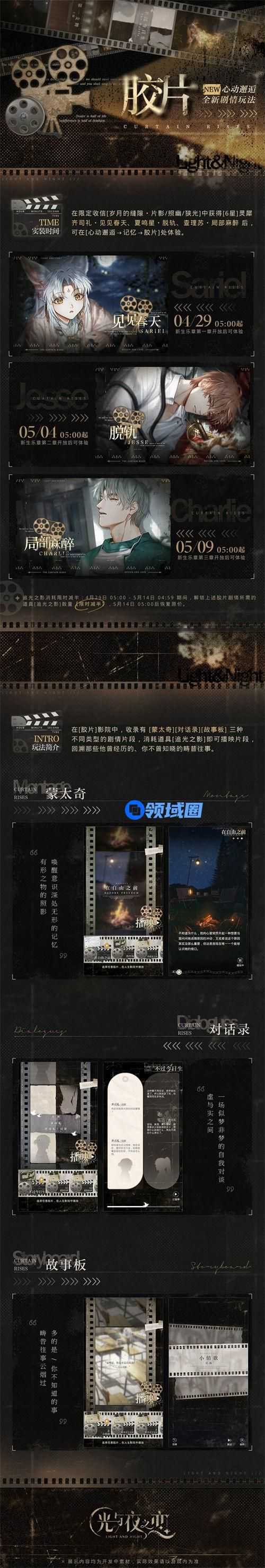 玩法简介:在[胶片]影院中,收录有[蒙太奇][对话录][故事板]三种不同类型的剧情片段,消耗道具[追光之影]即可播映片段,回溯那些他曾经历的、你不曾知晓的畴昔往事。