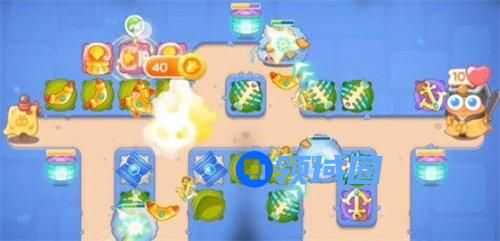 一开始,在下面建一个鱼骨刺,一个旋镖,锁住上面的草,打掉后,锁住左边的石板凳,打掉的位置放一个冰锥塔;