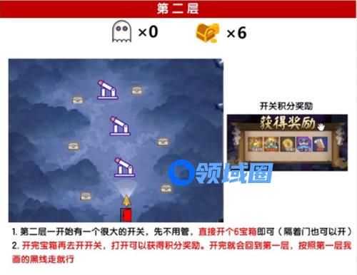 2、第二层:我们先开启6个宝箱,然后再去启动中央的机关可以获得积分,然后返回第一层。(沿着上图黑色路线移动)