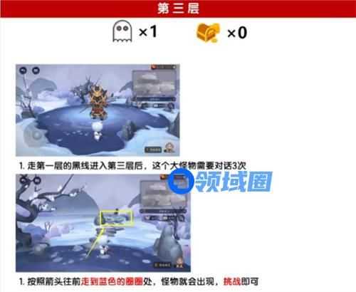 3、第三层:通过一层的黑色路线进入到第三层,然后和BOSS对话3次,然后一直往前走,触发BOSS挑战即可。