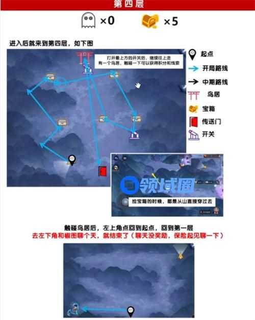 5、第四层:根据下图蓝色线路指引倒到鸟居后回到起点,向左下角的NPC对话即可。
