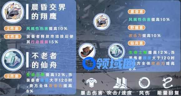 布洛妮娅的遗器套装还可以选择【晨昏交接的翔鹰】、【野穗伴行额快枪手】和【不老者的仙舟】的二加二加二组合,作为布洛妮娅的过渡遗器组合。