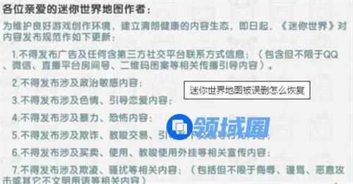 以上就是迷你世界地图误删恢复方法攻略的全部内容,更多精彩内容攻略请持续关注领域圈,小编将持续更新更多相关攻略。