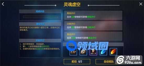 《剑与魔法》26级开启的灵魂虚空是一个活动副本,玩家每天可以挑战两次,通过击杀空旷的虚空之地中出现的数波强力怪物可以获得羽翼和坐骑的强化道具以及大量经验,还有可能掉落魔灵灵魂石。单人或者组队都是可以的,不过在这里还是推荐组队进行,因为结 算的奖励价值也是根据消灭怪物波数来决定的,毕竟人多力量大啊!成功击杀第5、10波怪物能获得特殊奖励,合理利用虚空之地中掉落的光球(绿色→回血,红色→加攻,蓝色→加防)可以暂时提升你的属性或者回复你的血量,助你更好的完成挑战!需要注意的是再剩余时间一分钟的时候不会再刷出新的怪物,而是出现一个虚空BOSS,一定要在1分钟之内击杀掉才算成功哦!