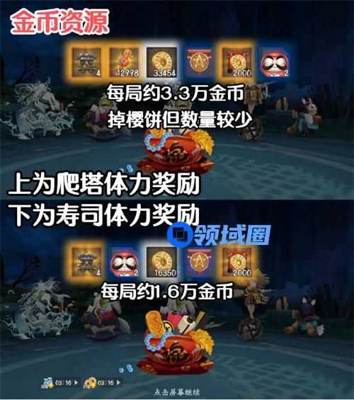1.金币:推荐,不吃铁鼠/金币加成(每日体力300局刷满约3360万,50爬塔体力刷满约1155万,寿司体力刷金币性价比最高)